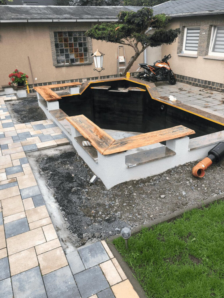 Auch wenn es aussieht wie ein Pool ist es dennoch ein Teich mit allem Drum und dran für die Koi Karpfen.
